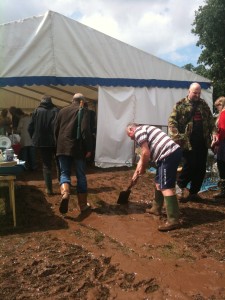 Nyheterna i England praglas just nu av en sak: Oversvamningar. Har i Derby har vi klarat oss ratt sa bra, men igar regnade det sa mycket att tradgardar oversvammades. Och inne i stan borjade man som sagt att bygga vallar for att hindra vattnet fran att floda in i affarerna. Sjukt. Trots att solen sken idag hade det uppenbarligen regnat sa mycket att dagens tur till ”The Antiques Fair” blev rena ler-klafsnings-kalaset. Jag har aldrig sett sa mycket lera i mitt liv…