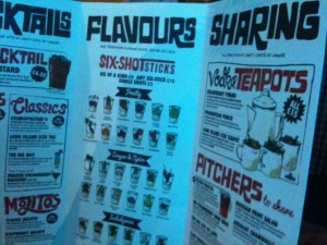 Drinklistan pa en av nattklubbarna. 6 shots for £9. Kan avsloja att ingen drack vin.