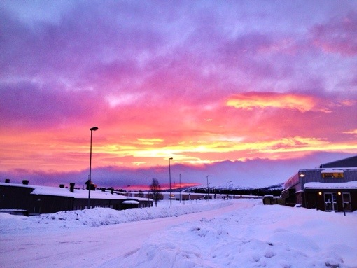 Det är så vackert här! Vit snö, rosa himmel…