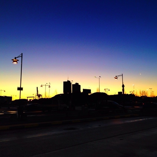 Måndagens soluppgång över ett öde Värtahamnen. Det har verkligen märkts att många fortfarande haft semester…