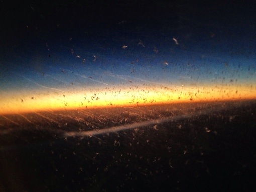 Vacker solnedgång utanför fönstret under hemflygningen…