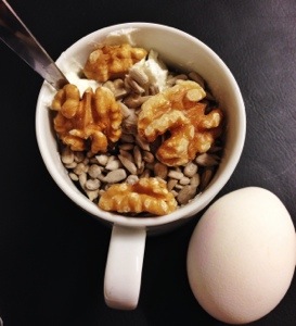 Dagens pre-träning mellanmål: kvarg o keso toppad med solrosfrön och valnötter. Och ett ägg. Sjukt ambitiöst! (Vem har jag blivit egentligen!!!?? Hahah Valnötterna donerades iofs från snäll kollega:)…)
