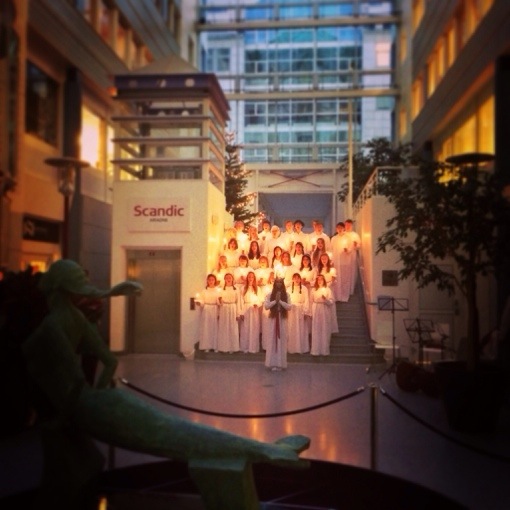 Vilken överraskning. Hade masat min träningströtta kropp ur sängen, (alldeles för tidigt,) trängts i en fullsatt tunnelbana, släpat mig till jobbet. Satt sedan bänkad vid jobbdatorn och satt och skrev som bäst, då jag plötsligt hörde ett hyssjande ljud ute i inomhusgallerian. Efter en stunds tisseltasslande hördes ett välbekant ljud: Stämsång. I mitt trötta huvud hade jag helt glömt bort att det var lucia:)