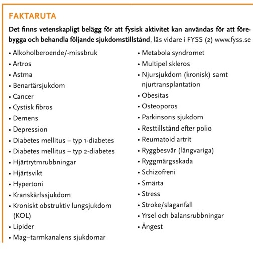 Många av vår tids vanligaste sjukdomar går att påverka genom livsstil. Men att framkalla beteendeförändringar är svårt, jag skulle nog vilja kalla det en av sjukvårdens största utmaningar. Fysisk aktivitet på recept, FaR är något jag tror på. Istället för en läkemedelsrecept får patienten med sig en ordniation på motion: 30 minuters promenad, 1 gång dagligen. Konceptet är redan välkänt i den somatiska vården. Alla vet att träning är extremt bra för hälsan. Det sänker blodtrycket, gör hjärtat starkare, stärker skelettet, minskar risken för både hjärt/kärl-sjukdom och cancer. Faktum är att konditionsnivå är den allra viktigaste faktorn när det gäller ”friskhet”. (Tillsammans med rökning.) Träningsgrad är alltså en betydligt bättre prediktor för livslängd än till exempel vikt, blodfetter eller kolesterolvärde. Det stämmer verkligen att det är bättre att vara tjock och vältränad än smal och otränad.