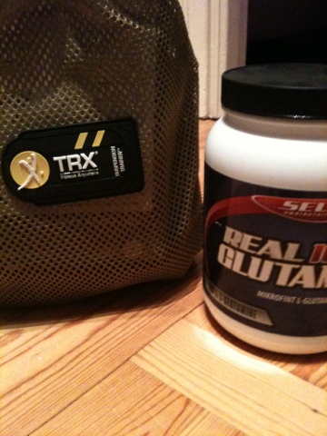 Ett TRX military-training kit, och en rejäl burk glutamin.