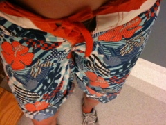 Efter att ha dissat diverse baby-shorts, och mini-badbrallor hittade jag ett par bermudashorts som jag kanske skulle kunna få igen i midjan. Dem tog jag snabbt som en vessla med mig in omklädningsrummet och konstaterade att de inte gick att få igen.