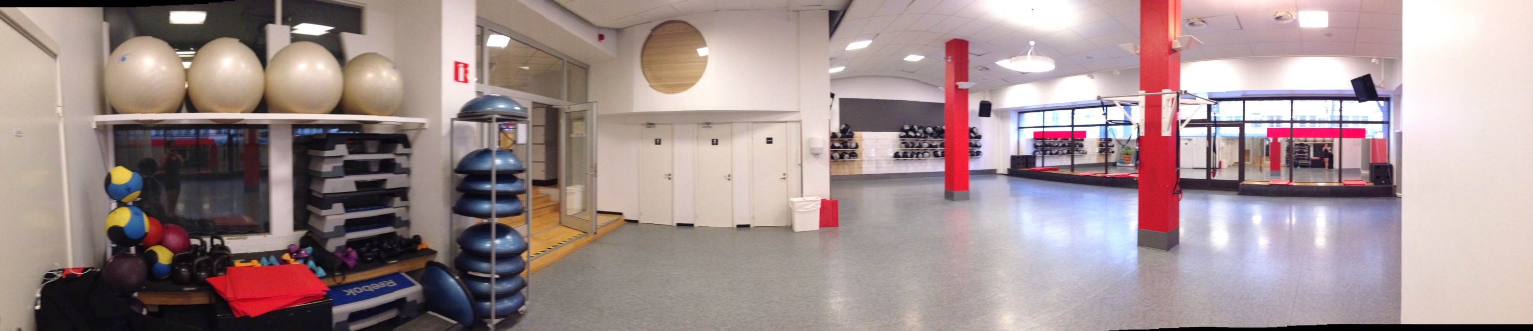 Panorama över tom gruppträningssal. Massor av möjlighrter, synd bara att jag är så trött.